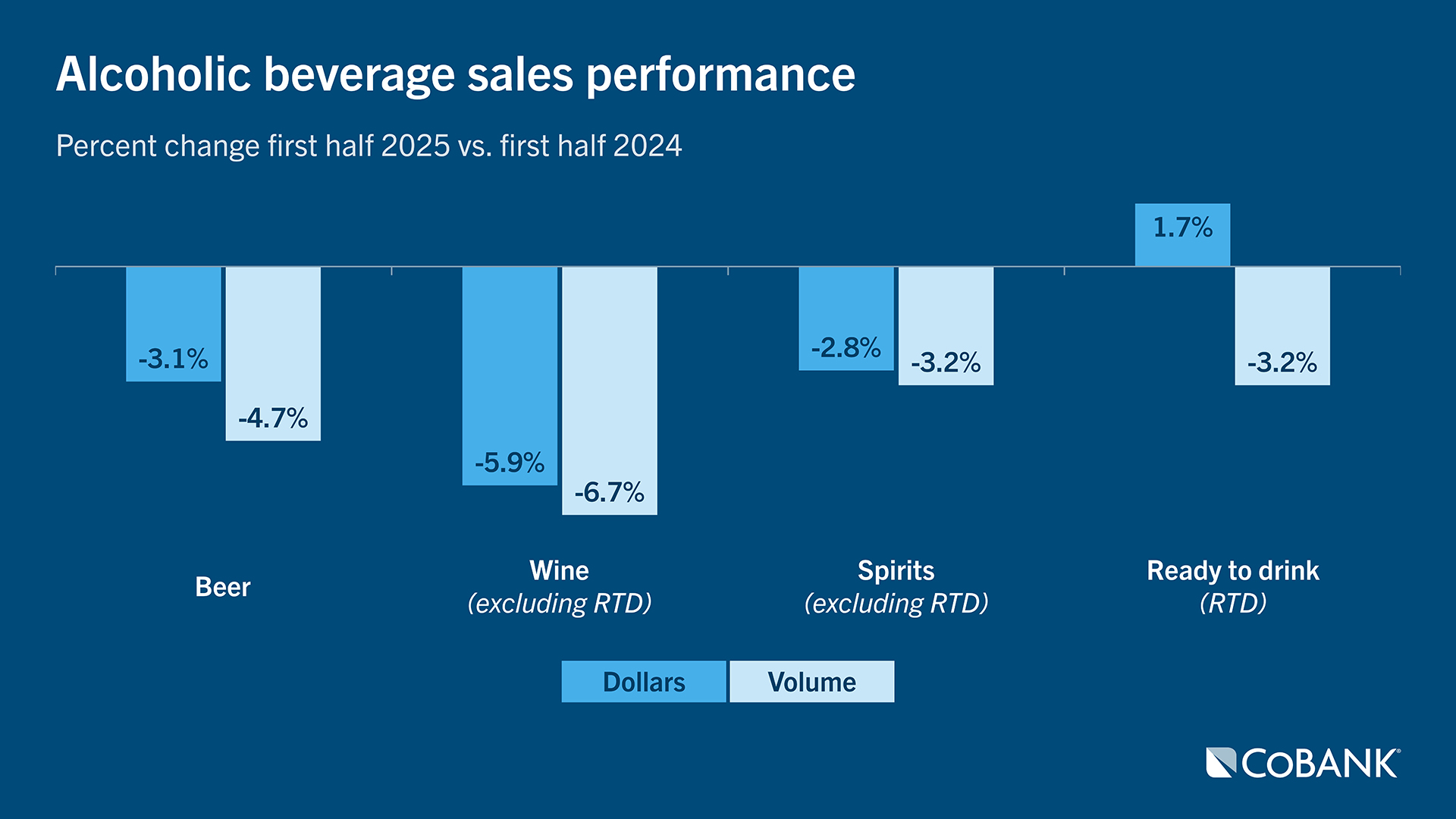 In the U.S. alone, wine consumption fell by 5.8% in 2024 and sales are not doing much better. Total U.S. wine sales were down 2.2% (-4.3% in volume terms) compared with the prior year for the 52 weeks ending Dec. 29, 2024, per Circana. Sales of spirits and beer are down as well. In the first half of 2025, total alcohol beverage sales were down 3% YoY, according to NielsenIQ’s “The Halftime Report,” with volume declines across the major segments. Dollar sales increased in only one category: ready-to-drink, the category of pre-mixed alcohol beverages packaged for convenience. The report notes that performance in the spirits segment faces challenges from RTD’s growth, yet in all alcohol segments volume sales have continued to erode. Beverage companies are facing those same headwinds in the second half of 2025, particularly with consumers shifting toward moderation, value and wellness.