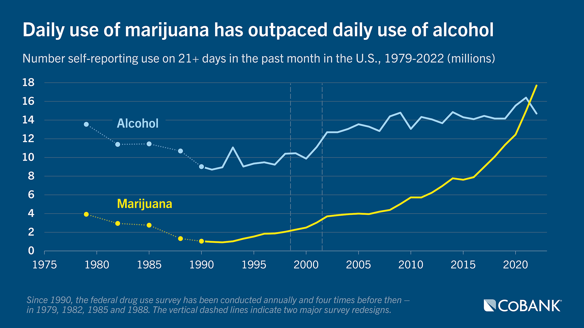While alcohol use has waned, cannabis consumption is on the rise. A 2022 study found 17.7 million people reported daily or near-daily marijuana use; comparatively, 14.7 million people reported drinking at the same frequency.